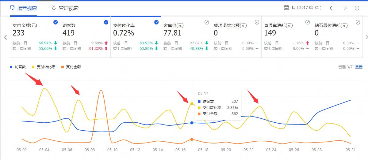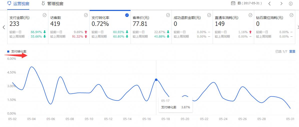 店铺的访客数,最高值是400多个访客,而支付转化率就更低了,且极不稳定