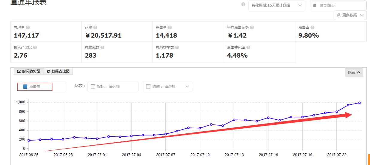 做好这三项后,大家可以看到直通车的点击率平均都是在9%以上,这样的车开起来,才能走得更顺,走得更快,店铺的成长离不开车子的辅助.只有把直通车的数据做好做稳了,单品的权重才会起来,店铺才会成长,大家可以看直通车的报表及成交笔数 也是一直呈增长曲线,现在直通车的点击率与转化率都是相当稳定,随着预算的增加,直通车成交的笔数也是直线增长,在这样的,高点击率,高转化率的数据支撑下,推广的单品的排位也是日 日 上涨,获取访客的能力也是渐渐增强,因此我才跟大家分享说,这家店铺的成长绝对离不开直通车的推广.