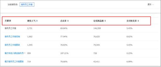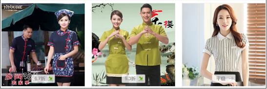 个性化搜索趋势下,淘宝搜索引擎最喜欢的宝贝就是各方面都高度相关的宝贝,我们按照前两步,每个宝贝都围绕着一个核心关键词了,接下来,你的首图和详情页也要去围绕着这样的一个核心关键词去做。我们举个简单的例子,比如,作为一个小店新店,你准备竞争这个词:服务员工作服 餐饮
