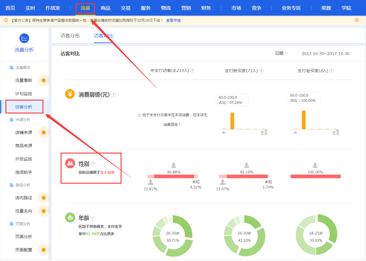 在这里我们可以通过生意参谋的流量里面访客分析,点击访客对比。来找到适合我们店铺的人群。