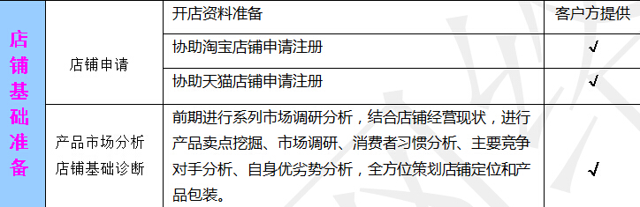 首先第一点是店铺基础准备,巧妇难为无米之炊,既然要做淘宝代运营,那么一个淘宝网店是必须要有的。如果您是一个已经拥有淘宝网店或天猫网店等等或者京东店铺也好,这一步您可以跳过。如果您是一个准备做淘宝这一块,还没有网店的话,那么正好适合这第一步的服务:店铺基础准备
